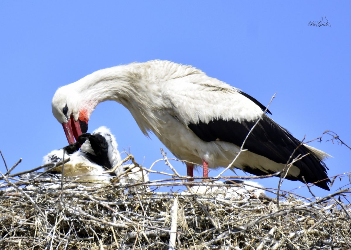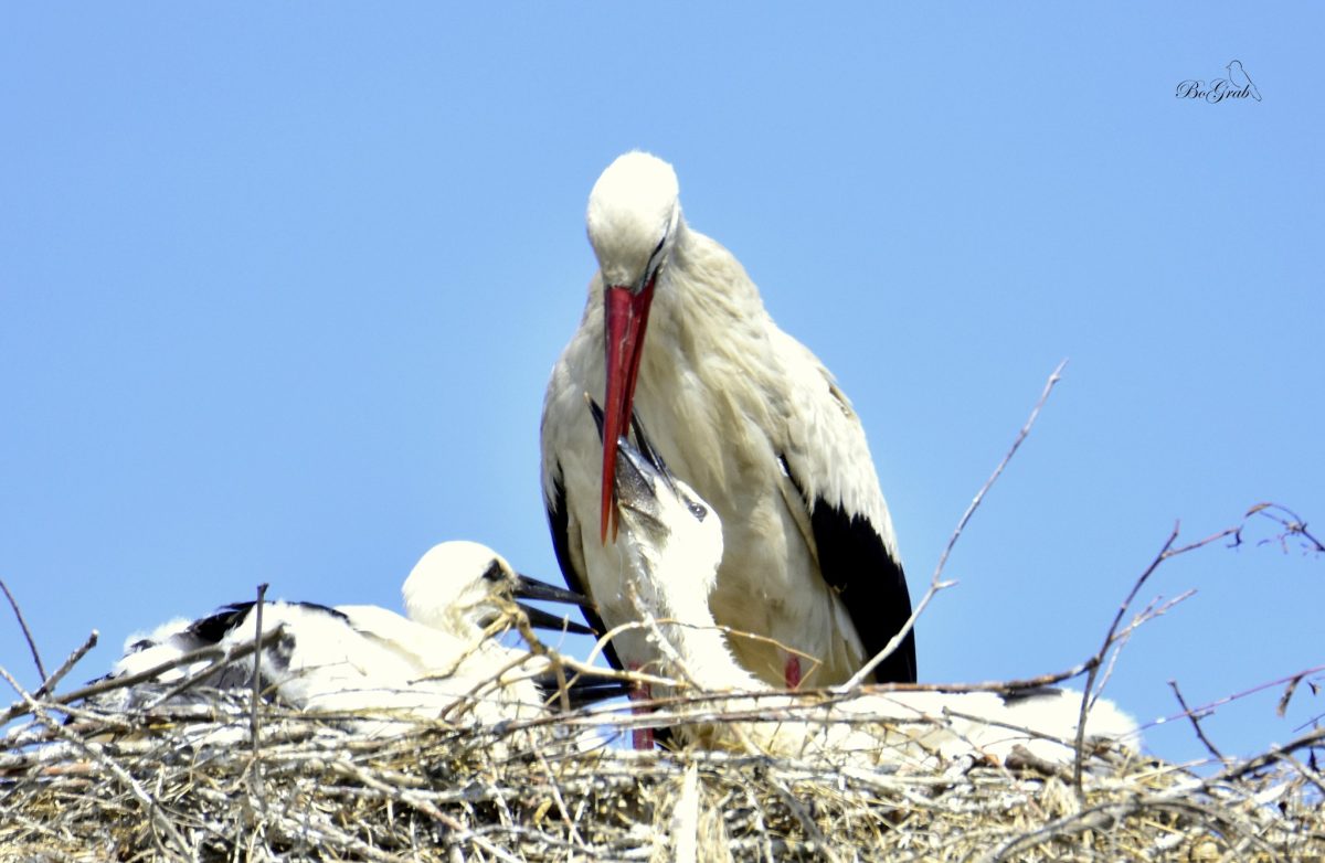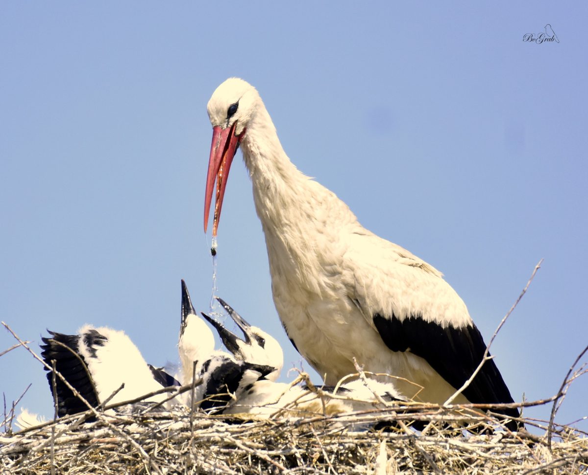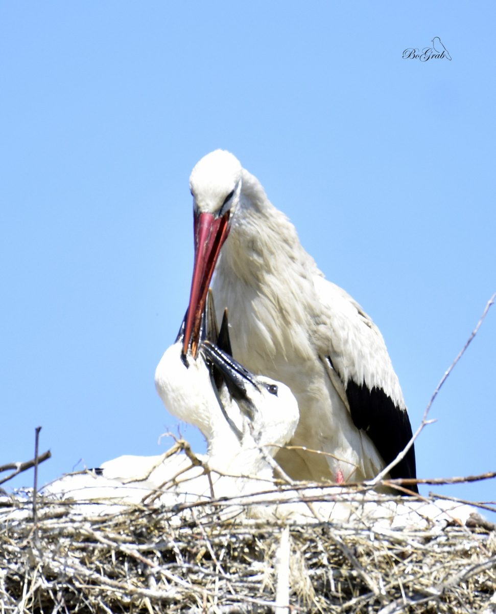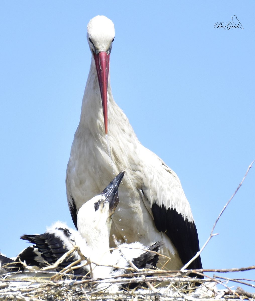 Jadąc przez Pawłowice k/Kiekrza zatrzymałem się (no bo jak inaczej) przy jednym z dwóch gniazd bocianich. Było mi bardzo żal młodych, które siedząc w gnieździe w pełnym słońcu widać było, że są spragnione. I nagle nadleciał jeden z rodziców i zaczął pić i karmić z dzioba młode…Widok niezapomniany! Wiedziałem, że tak to się odbywa ale zobaczyć to na żywo to inna sprawa.